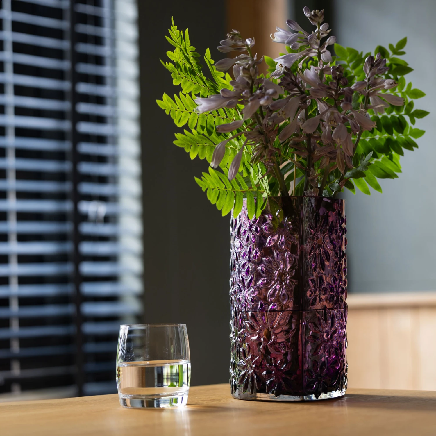 The vase’s generous proportions allow it to serve as a striking focal point, whether adorned with flowers or standing alone. Its rich amethyst hues and substantial presence will elevate your home decor and transform your living space.