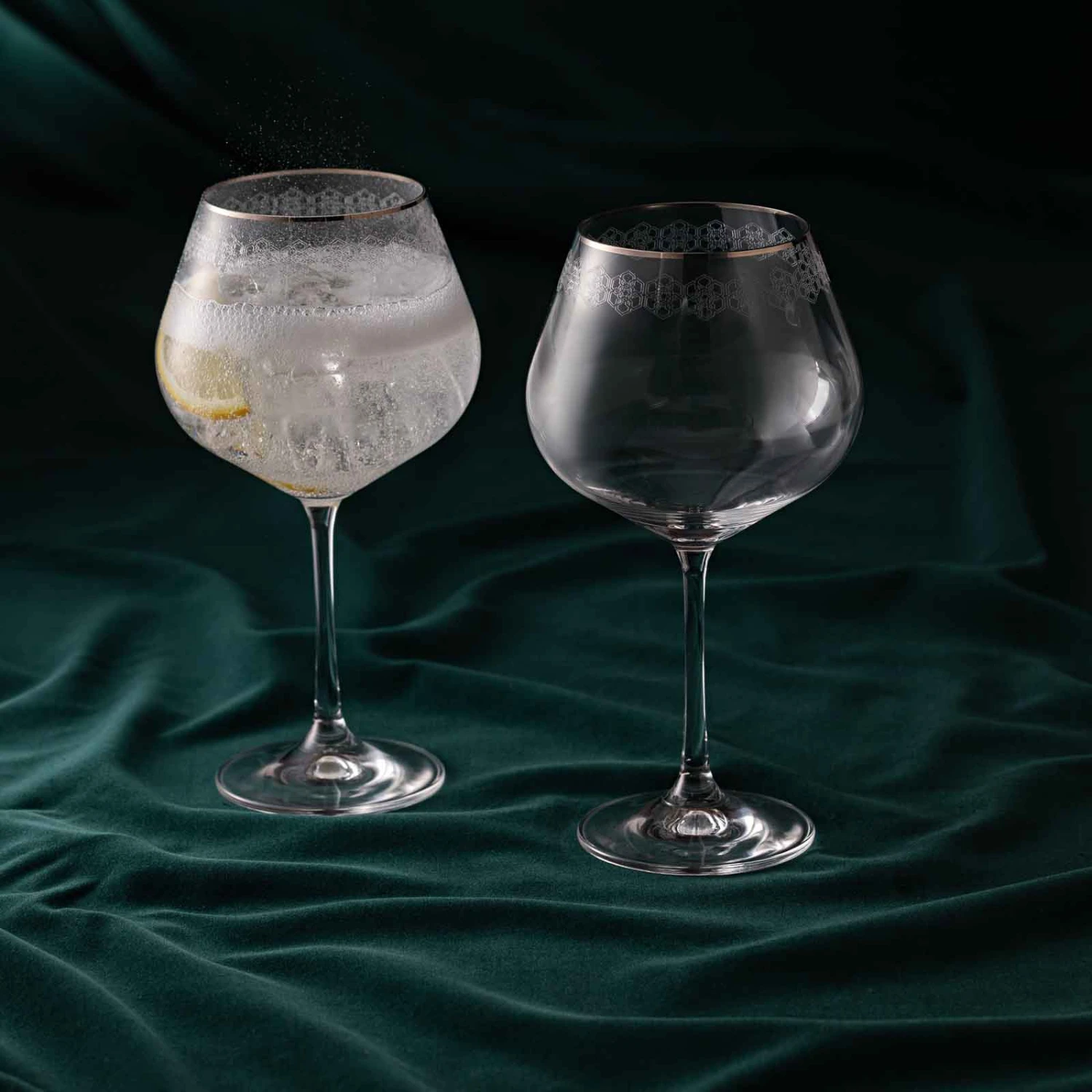 Inspired by the designs of the roaring twenties, Gatsby is both elegant and sophisticated. Subtly decorated with its lattice design and finished off with a fine platinum rim which wraps around these classic G & T glasses, it creates the ideal presentation for your favourite drink.