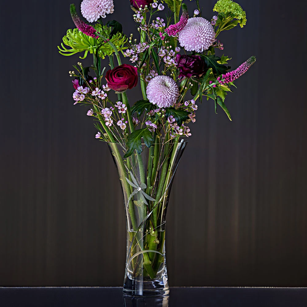 Sparkling crystal elements and a hand engraved Dragonfly motif make this lovely vase a versatile choice suitable for most long stemmed flowers.