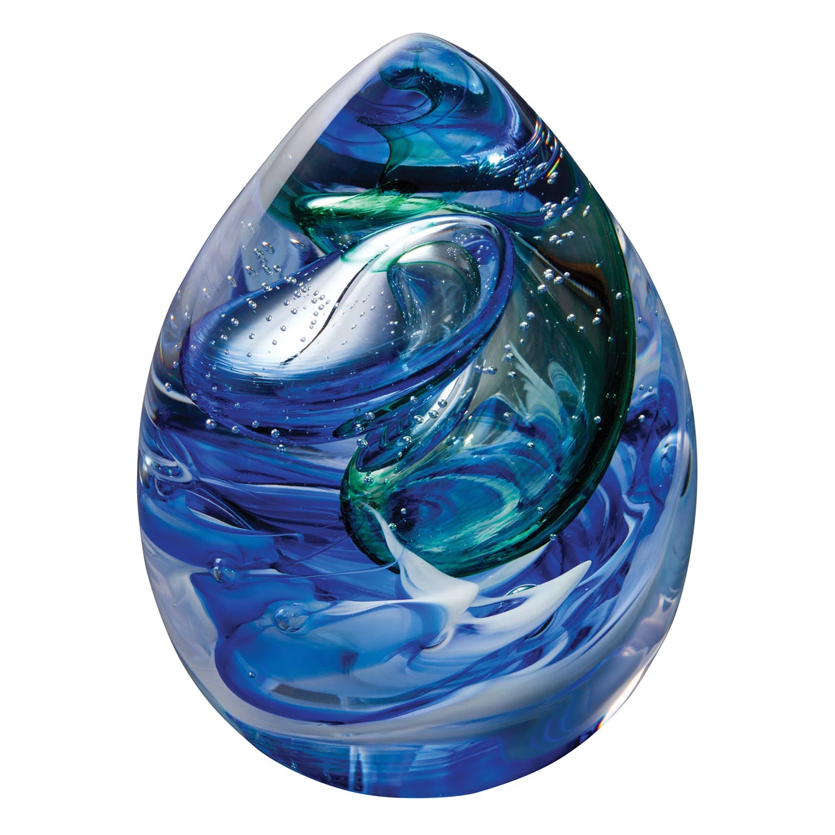 Turbulent waves are given life inside this glass dome, exploring the hidden depths of the ocean. Handcrafted using tiny bubbles and swirls of blue, it becomes an artistic showpiece for ocean lovers.