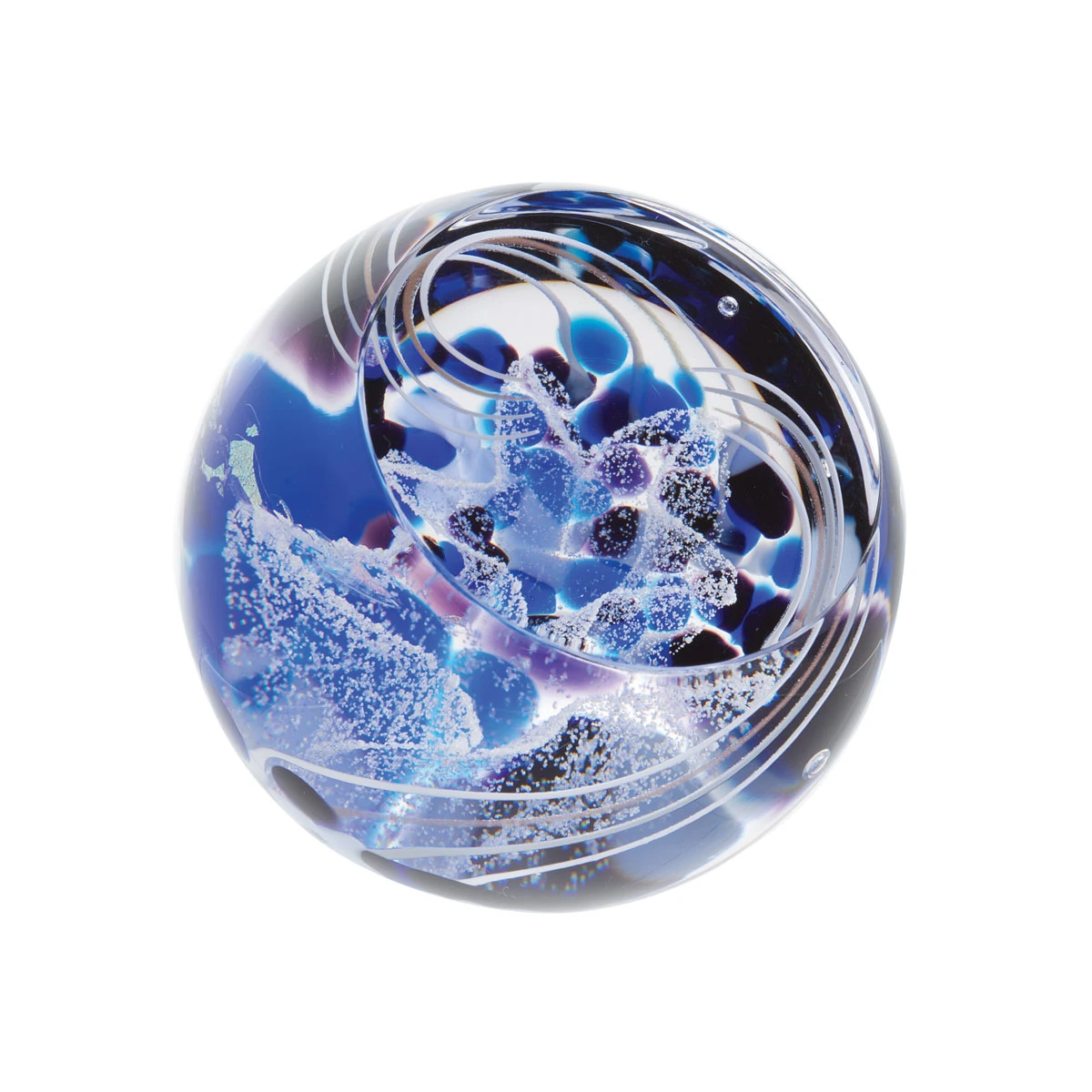 Make a wish on the lone star embryo suspended in this cosmic paperweight. Meticulous hot glass sculpting creates a glittering starburst swirl of silver glass against an inky night sky backdrop. A handcrafted treasure from Caithness artisans, this galactic accent makes an uplifting gift.